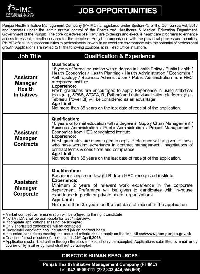 The job purpose of the Assistant Manager Health Initiatives is to support the Deputy Manager/Manager Health Initiatives in working on technical documents for the conceptualization and successful implementation of Health Initiatives undertaken by the Company, including health insurance schemes/Universal Health Coverage.
