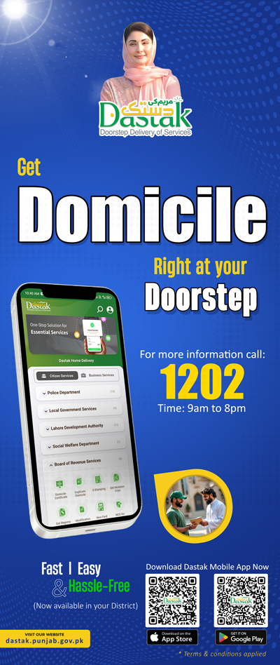 Domicile is required for this position. For Getting Domicile at home through flagship initiative of Government of Punjab, Call 1202 or download the Dastak Doorstep Delivery App now!