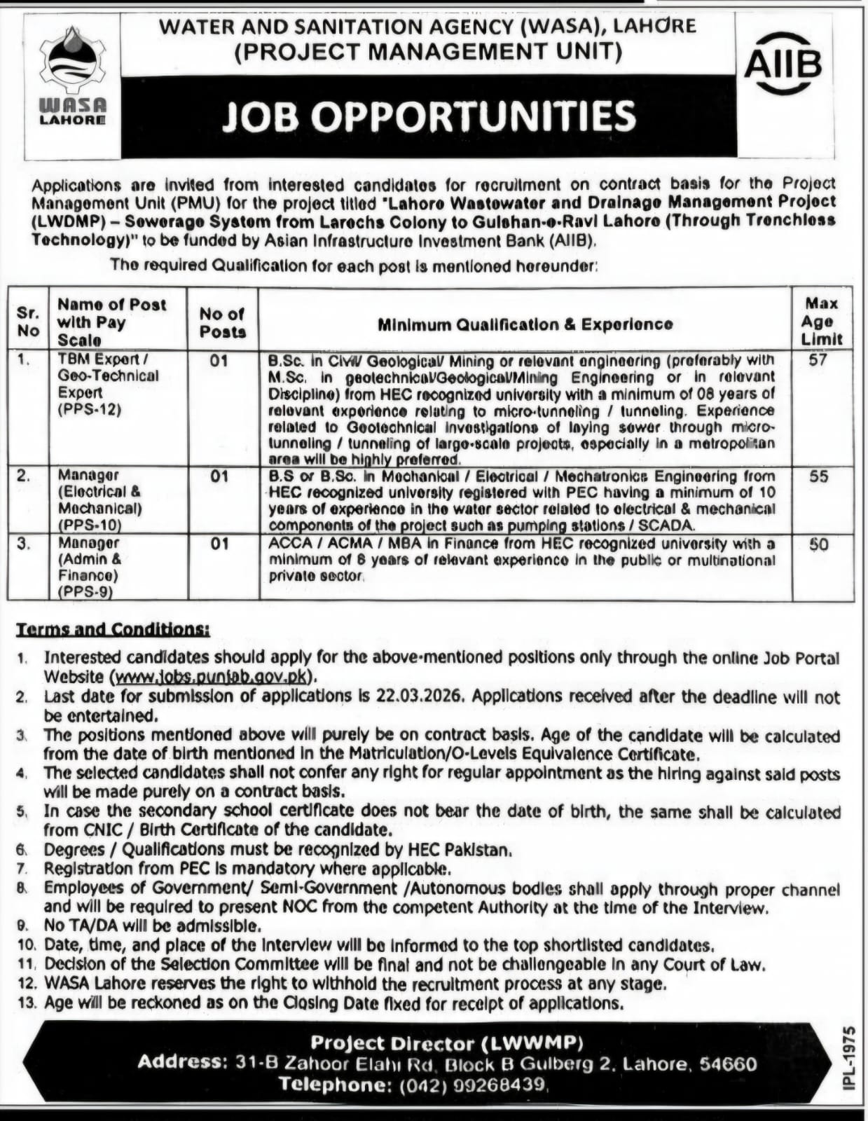Applications are invited from interested candidates for recruitment on contract basis for the Project Management Unit (PMU) for the project titled “Lahore Wastewater and Drainage Management Project (LWDMP) – Sewerage System from Larechs Colony to Gulshan-e-Ravi Lahore (Through Trenchless Technology)” to be funded by Asian Infrastructure Investment Bank (AIIB). The required Qualification for each post is mentioned hereunder: